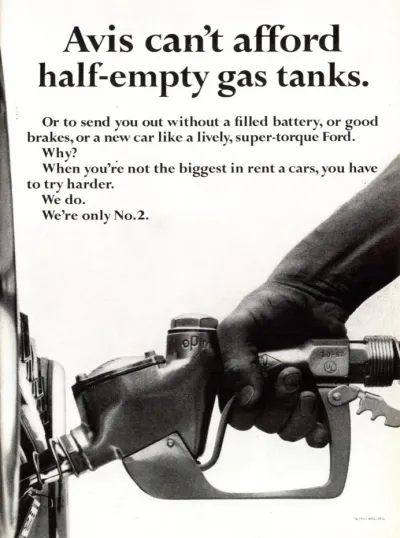 Avis je dejstvo, da je bil drugi največji ponudnik najema avtomobilov, obrnil v marketinško prednost, saj je kot izzivalec, kot je trdila znamka, preprosto bolj garal.