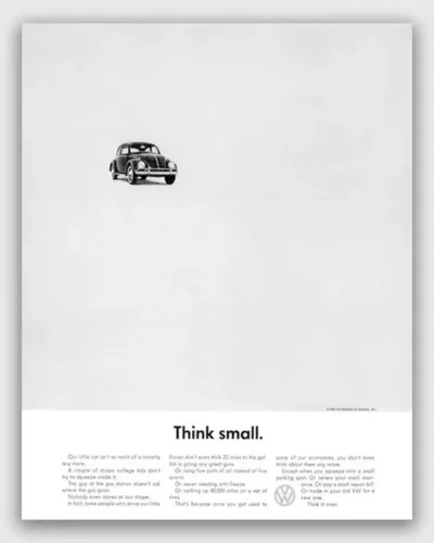 S svojo iskrenostjo in minimalizmom je Volkswagnov oglas »Think Small« porušil vsa takratna oglaševalska pravila. Še danes velja za enega najboljših oglasov vseh časov.