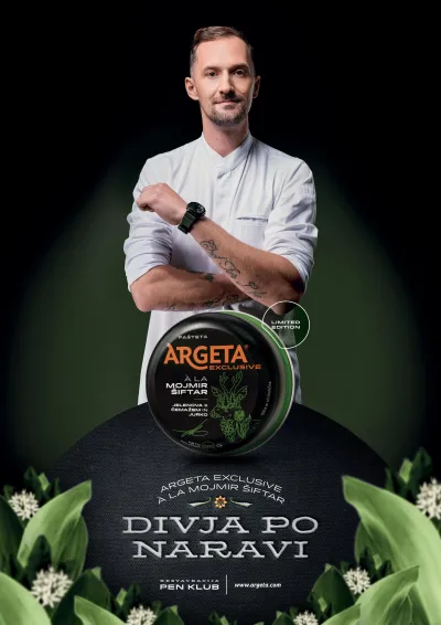 Kratek opis akcije: Zgodba linije namazov, ki v domove potrošnikov prinaša vrhunske okuse in gurmanske izkušnje, se je začela leta 2009. Šestnajst let podznamke Argeta Exclusive so zaznamovala največja imena domače in tuje kulinarične scene, nabor okusov pa je letos dopolnil že 13. chef Mojmir Šiftar, ki ga mnogi poznajo tudi z malih zaslonov, s svojimi izvirnimi krožniki in domišljijo pa navdušuje goste restavracije PEN Klub. Navdih za svoja kulinarična ustvarjanja pogosto poišče v naravi, še najraje v Prekmurju, kamor segajo njegove korenine. Ne le jedi, ki jih ponuja svojim gostom, tudi novo Argeto Exclusive so navdihnili okusi Prekmurja. V črno dozico je tako ujel bogat okus jelena v spremljavi aromatičnega čemaža in sladke sorte grozdja, prekmurske jurke.
